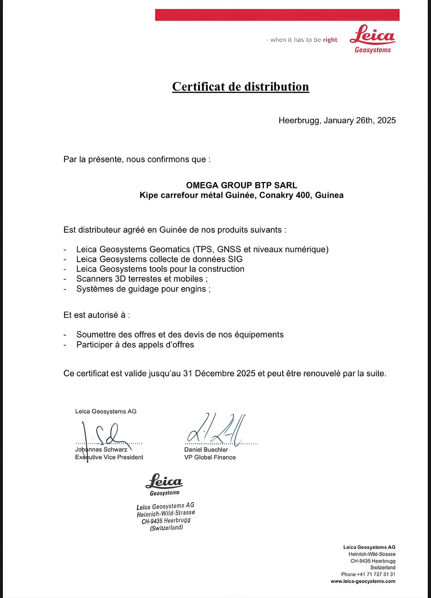 La singularité et la force d’OMEGA résident dans son partenariat stratégique avec la marque suisse Leica Geosystems, leader mondial dans la fabrication d’équipements topographiques de précision. En tant que représentant officiel de Leica, OMEGA fournit aux ingénieurs, géomètres et entreprises de construction des solutions de pointe pour la conception, l’étude et la réalisation de projets. Cette exclusivité fait du groupe un partenaire incontournable pour tous ceux qui recherchent fiabilité, innovation et précision dans leurs travaux.